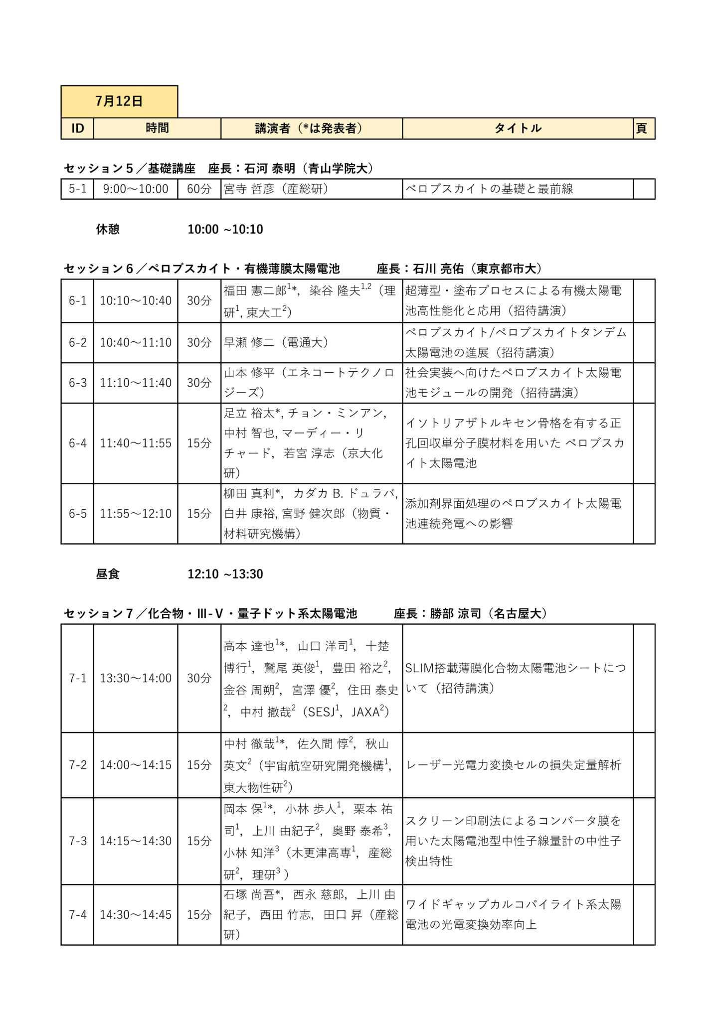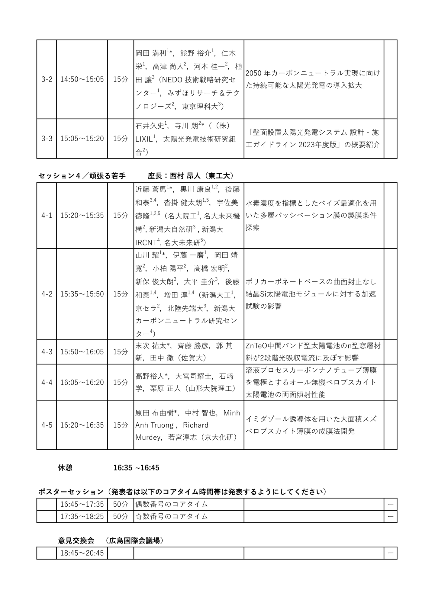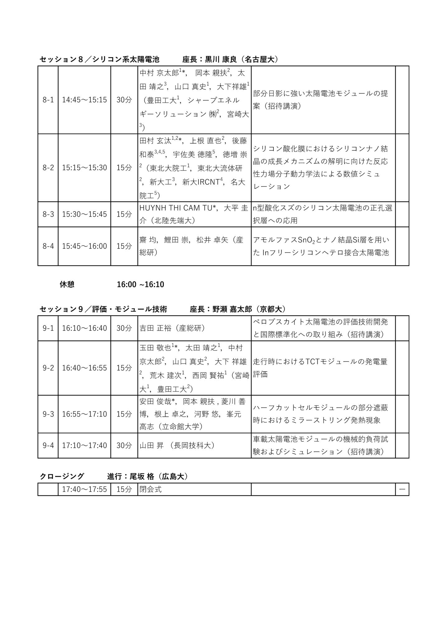 | 招待講演 | 岡本 晋(長州産業) 「太陽光発電の未来」 荒木 健二(ウエストエネルギーソリューション) 「民間企業の太陽光発電設置の取組み事例紹介」 杉本 広紀(PXP) 「次世代型太陽電池の新領域への展開」 中島 昭彦(カネカ) 「次世代BIPVの普及拡大に向けた取組」 森部 昌一(三菱総研) 「太陽光発電の国内リサイクル・リユースの動向」 福田 憲二郎(理研) 「超薄型・塗布プロセスによる有機太陽電池高性能化と応用」 早瀬 修二(電通大) 「ペロブスカイト/ペロブスカイトタンデム太陽電池の進展」 山本 修平(エネコート) 「社会実装へ向けたペロブスカイト太陽電池モジュールの開発」 高本 達也(シャープ) 「SLIM搭載薄膜化合物太陽電池シートについて」 中村 京太郎(豊工大) 「部分日影に強い太陽電池モジュールの提案」 吉田 正裕(AIST) 「ペロブスカイト太陽電池の評価技術開発と国際標準化への取り組み」 山田 昇(長岡技科大) 「車載太陽電池モジュールの機械的負荷試験およびシミュレーション」 |