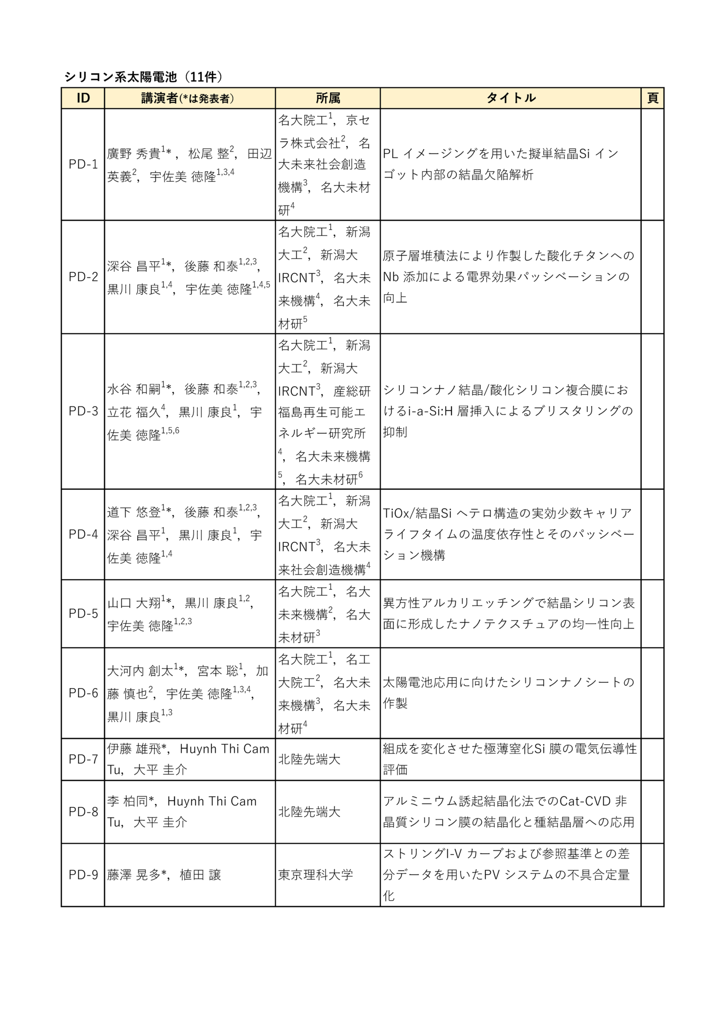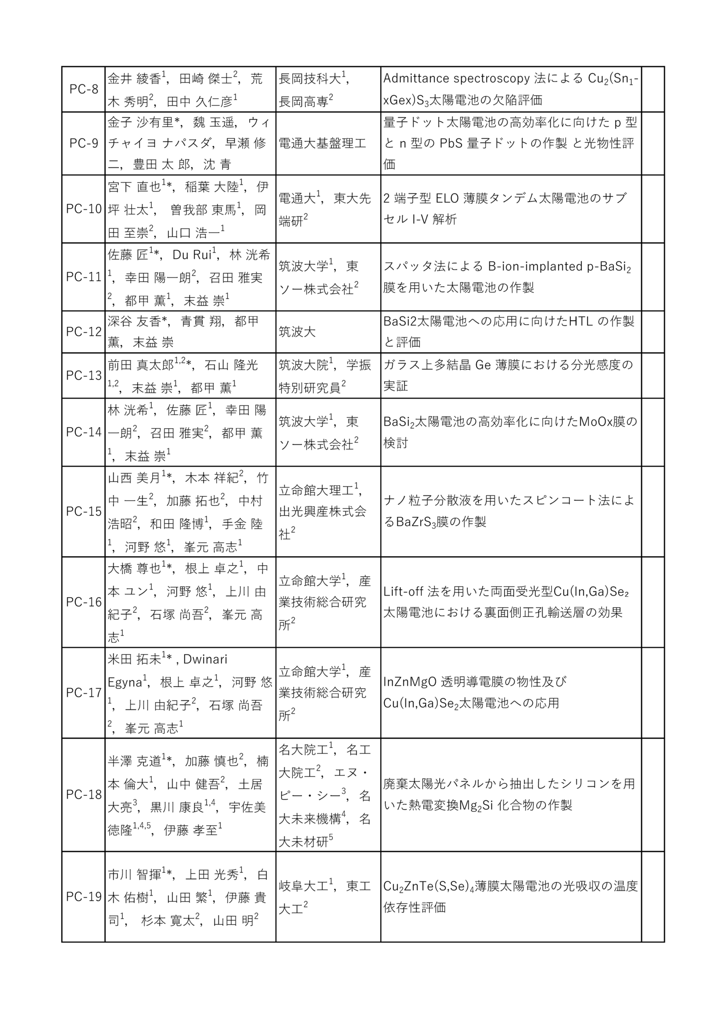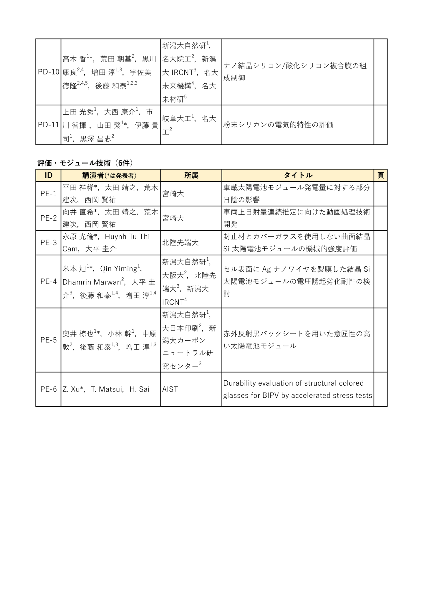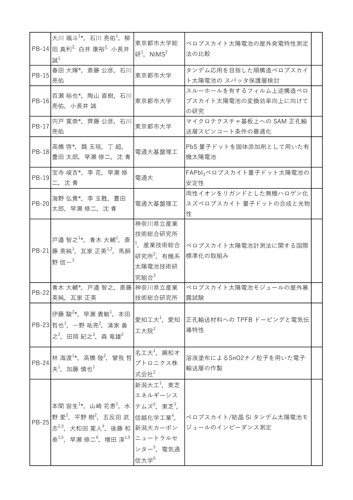 | 招待講演 | 岡本 晋(長州産業) 「太陽光発電の未来」 荒木 健二(ウエストエネルギーソリューション) 「民間企業の太陽光発電設置の取組み事例紹介」 杉本 広紀(PXP) 「次世代型太陽電池の新領域への展開」 中島 昭彦(カネカ) 「次世代BIPVの普及拡大に向けた取組」 森部 昌一(三菱総研) 「太陽光発電の国内リサイクル・リユースの動向」 福田 憲二郎(理研) 「超薄型・塗布プロセスによる有機太陽電池高性能化と応用」 早瀬 修二(電通大) 「ペロブスカイト/ペロブスカイトタンデム太陽電池の進展」 山本 修平(エネコート) 「社会実装へ向けたペロブスカイト太陽電池モジュールの開発」 高本 達也(シャープ) 「SLIM搭載薄膜化合物太陽電池シートについて」 中村 京太郎(豊工大) 「部分日影に強い太陽電池モジュールの提案」 吉田 正裕(AIST) 「ペロブスカイト太陽電池の評価技術開発と国際標準化への取り組み」 山田 昇(長岡技科大) 「車載太陽電池モジュールの機械的負荷試験およびシミュレーション」 |